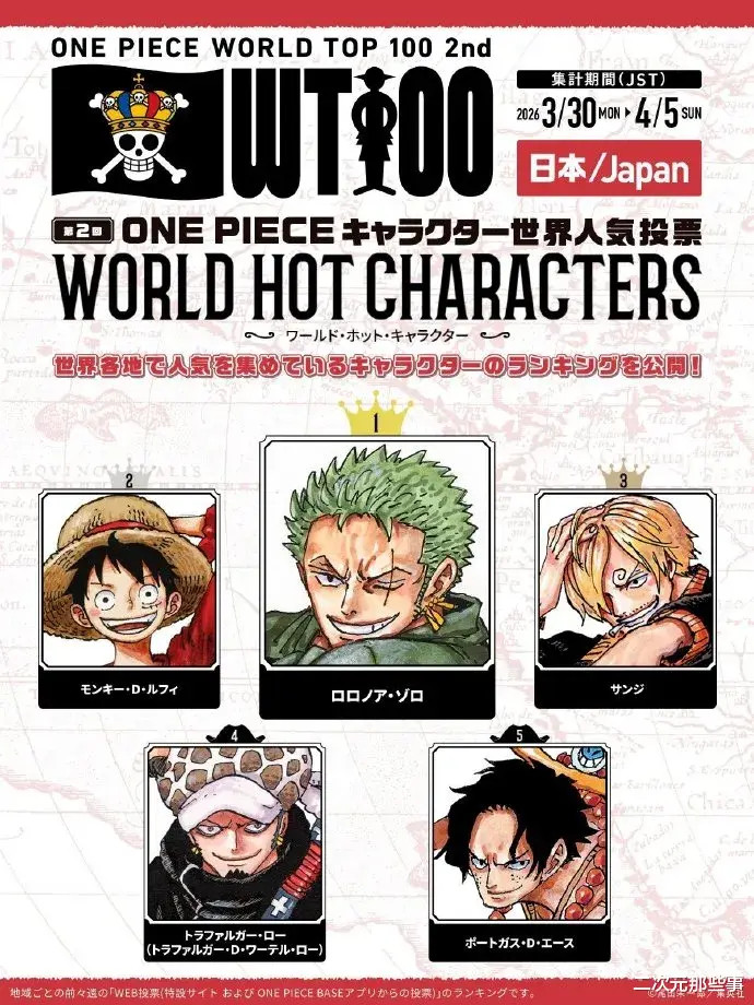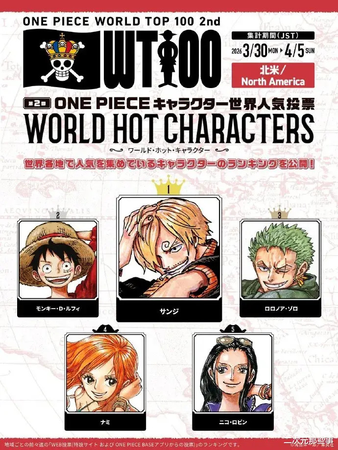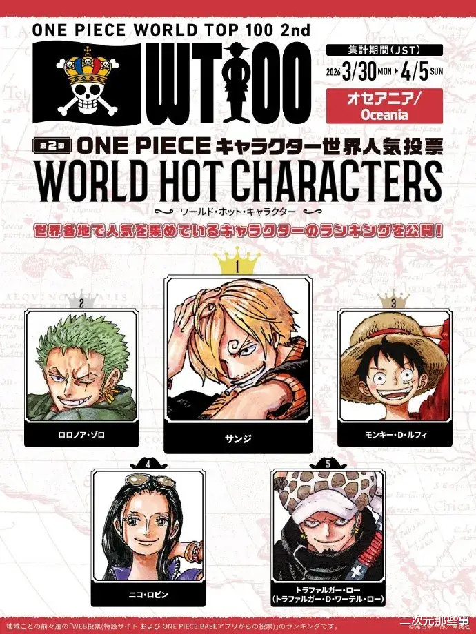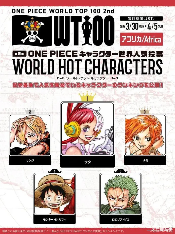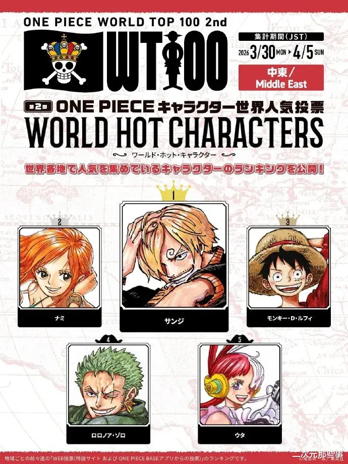 中南好意思地区:第又名:山治 第二名:索隆 第三名:娜好意思 第四名:乌塔 第五名:路飞