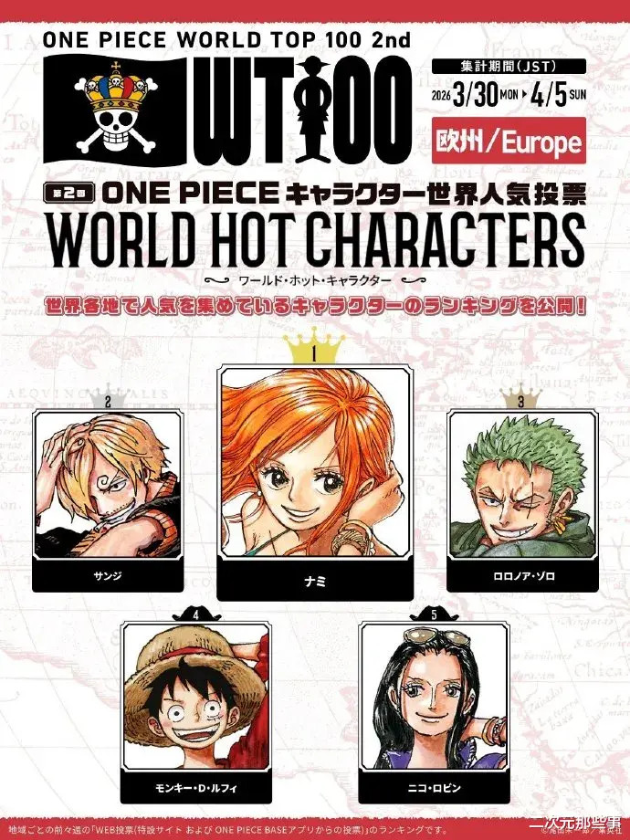 欧洲地区:第又名:娜好意思 第二名:山治 第三名:索隆 第四名:路飞 第五名:罗宾