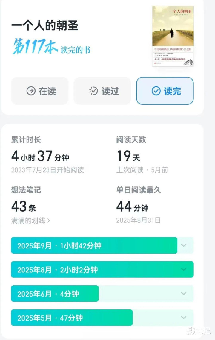 客岁我看过印象最深的书是《一个东谈主的朝圣》,全书阅读时长惟有4小时37分钟,我却断断续续拖了5个月才看完,来源零散无聊乏味,好几次看不下去,可读完之后却潜力十足,也许这即是经典书的魔力吧。