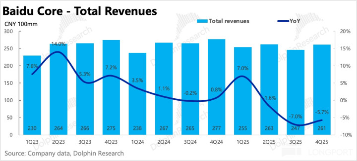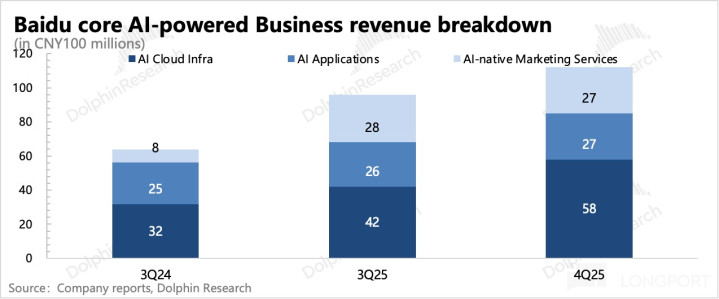 本季度认真继承新架构进行功绩露馅,分为 AI 业务和其他传统业务两部分,AI 业务包含 AI 基础才能、AI 独揽以及 AI 原生营销。由于机构如故按照原架构来给预期,因此这次海豚君尽量还原成旧露馅形状来进行对比分析,并依旧蔼然百度部分,不包括爱奇艺。