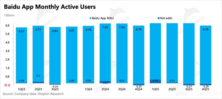 海豚君倾向于传统告白还在底部造反,毕竟百度传统告白受到宏不雅环境、行业表里竞争的影响。四季度手百用户无间流失,MAU 滑落至 6.79 亿。尽管有季节性影响,但贯串两个季度捏续下落,很难澌灭同业竞争的影响,尤其是腾达代的 AI Chatbot。