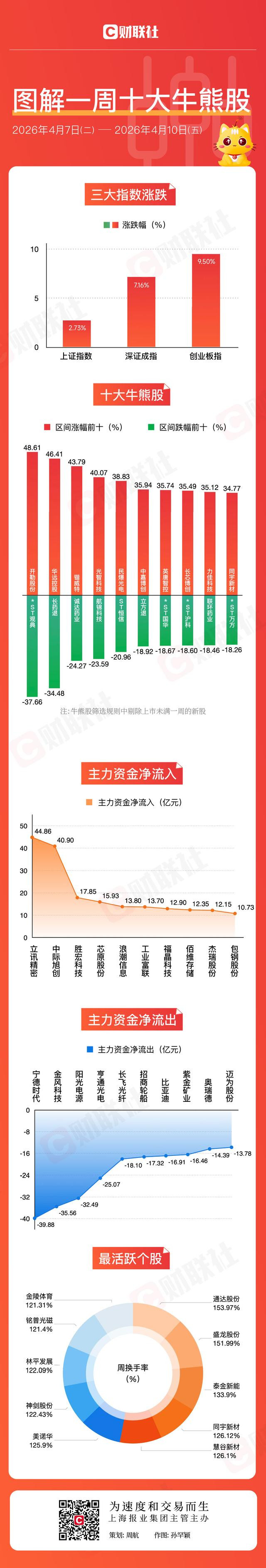 财联社4月12日讯,本周A股三大指数反弹拉升,其中上证指数周涨2.73%,深成指周涨7.16%,创业板指周涨9.60%。本周半导体、耗尽电子板块涨幅居前,CPO、电子化学品观念股进展活跃。