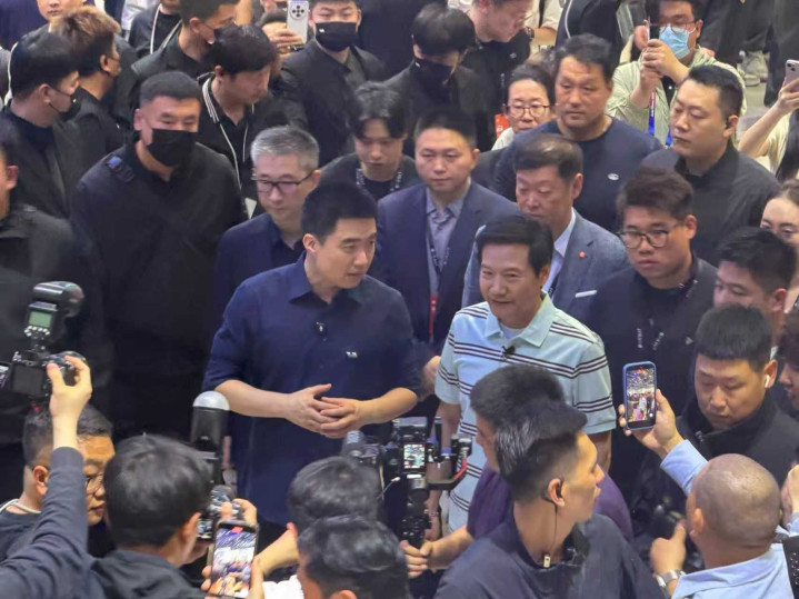 小米汽车和理思汽车同处A4展馆,展台相邻,雷军与理思汽车董事长兼CEO李思互访展台。