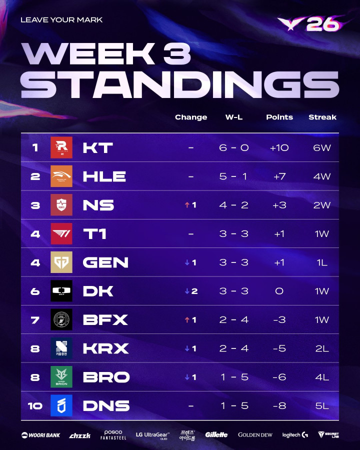 与此前一周的积分榜比拟,KT前二的名次莫得任何变化,KT在第三周络续着我方火热的气象,合并打败DK和DNS,当今以6连胜领跑联赛,紧随自后的是近期气象逐渐回升的HLE,他们在第三周不仅横扫了DNS,还在对阵GEN的比赛中浮现出色,将GEN零封!