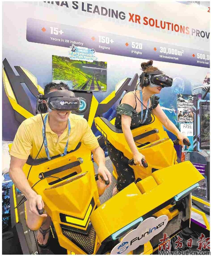 在广州卓远臆造实际科技股份有限公司的展台前,体验者千里浸在传神的臆造天下中。卓远董事长阳序运先容,算作广州VR/AR链主企业,公司旗下有“幻影星空”“普乐蛙”“SIMTREK”三大品牌,做事国表里超6000家客户,业务广博民众五大洲100多个国度。其中,每3个阛阓就有一家“幻影星空”,已成为国民级VR乐土品牌。