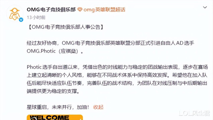 涅槃组的OMG战队,新赛段曾经2连败了,后续还剩3场比赛,要是链接输下去的话,OMG将提前半年休假备战S17,俱乐部最近也在思惟法,擢升队伍战力,尽可能保留第三赛段但愿,在摆脱东说念主市集看了一圈之后,OMG取舍签劣等一赛段,在IG效率的AD选手Photic,和太子竞争上岗。
