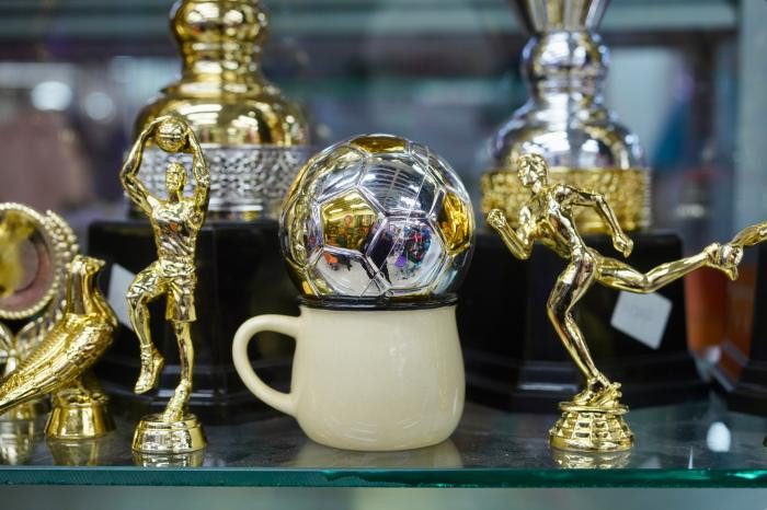4月21日,商家成列的足球类奖杯配件。2026年好意思加墨世界杯附进,义乌市集关联居品订单执续增长。中新社记者董易鑫摄