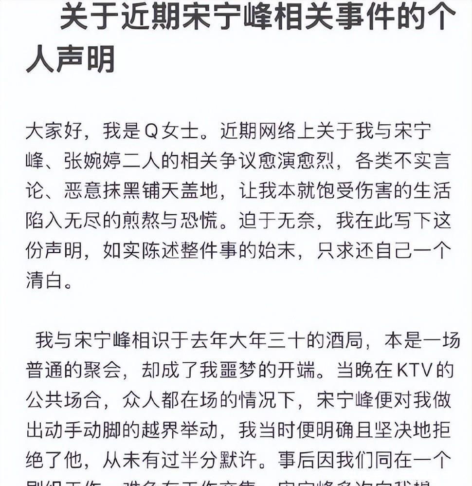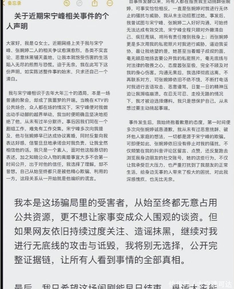 据Q女士流露,宋宁峰和张婉婷早在2025年就已经签好仳离公约,况兼张婉婷我方也承认了这事儿,让整件事情愈加复杂了。
