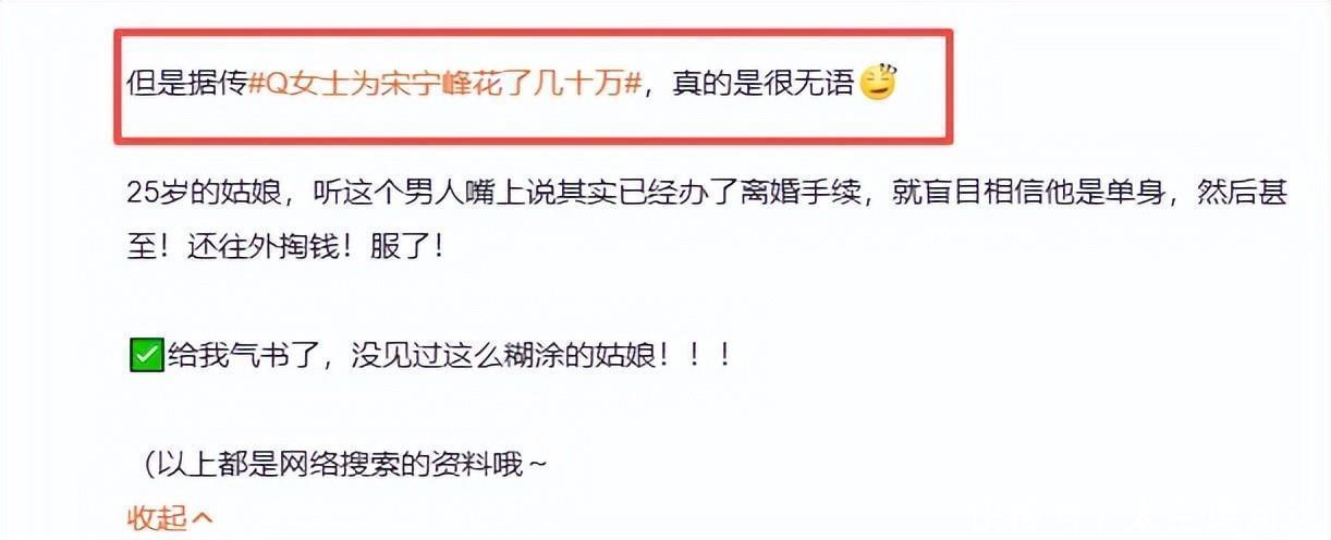 Q女士在声明中提到,往日一年多来,她为宋宁峰购置糜掷并承担商务支出,耗尽共计数十万,压根没让宋宁峰掏过一分钱,等于是包养了宋宁峰。