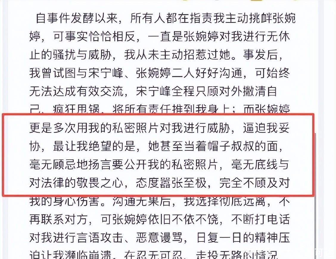 3月31日晚上,她曝光了7分48秒的齐备灌音和大量聊天记载,揭露了宋宁峰怎样主动蛊惑、隐蔽婚配、擅自会面、冲突冷凌弃,还包括张婉婷用裸照恐吓的全流程。