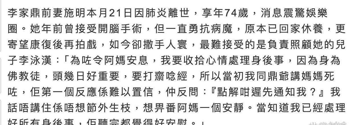 施明须臾离世,最伤心的应该是她的近亲、家东谈主,然则施明的前夫以及小女儿李泳豪全齐不知情,直到施明的后事办已矣,才被讲述到,这听起来似乎有点难以置信。施明与前夫李家鼎有一双双胞胎女儿,施明前几年颠仆昏厥作念了手术出院后,她就搬到宗子李泳汉家居住,由宗子关切。由于施明与李家鼎也曾仳离多年,相互是各自生涯,李家鼎对施明的现状也只可透过宗子李泳汉得知。而施明的小女儿李泳豪与宗子李泳汉昆季之间有矛盾,也曾多年不相闻问,对母亲的现状也只可透过父亲了解。因此也唯一李泳汉最了了施明的情况,如果他不对外文告,也着实莫得东谈主剖释施明也曾离世的音讯。